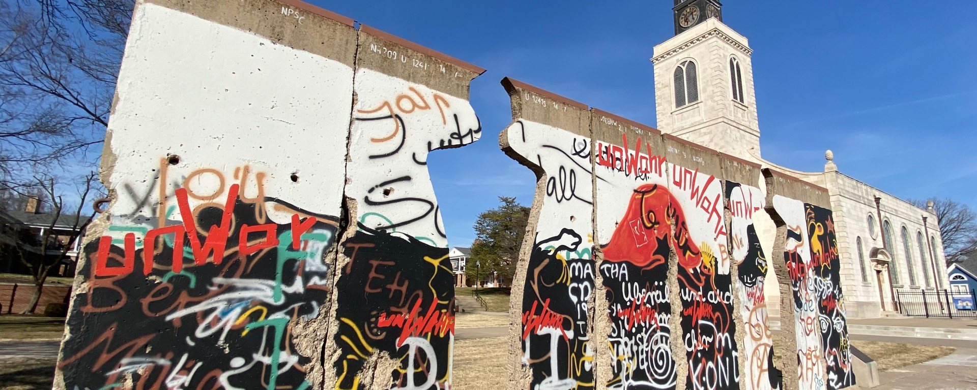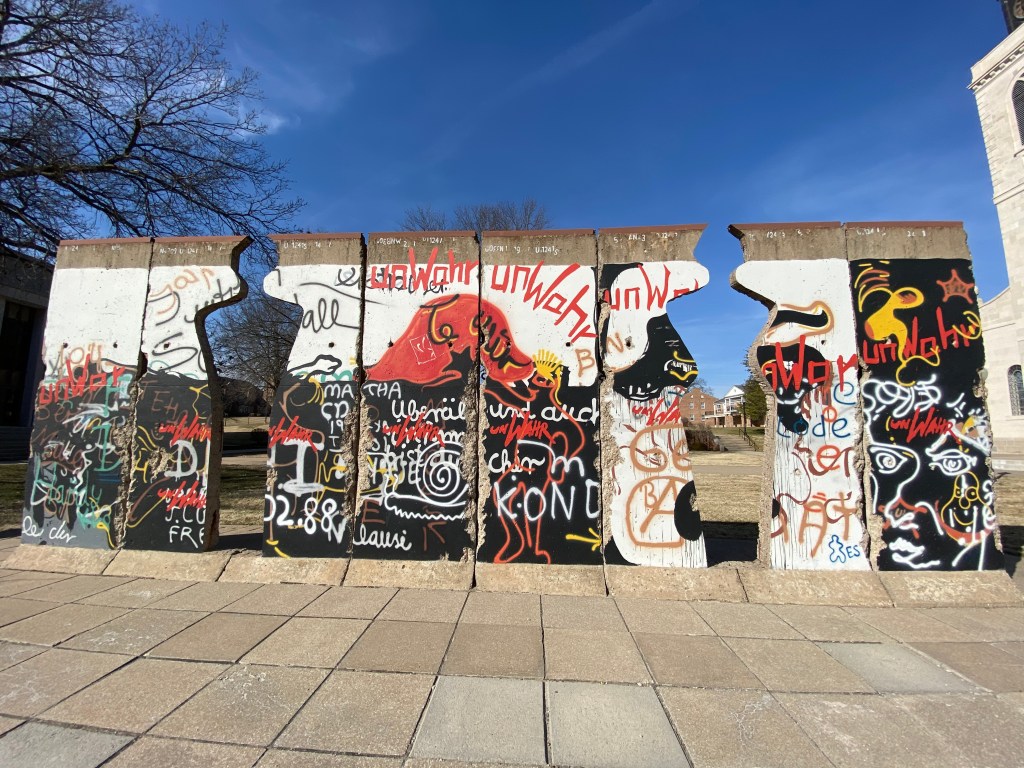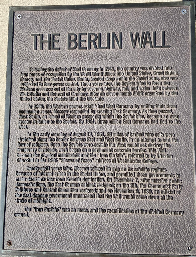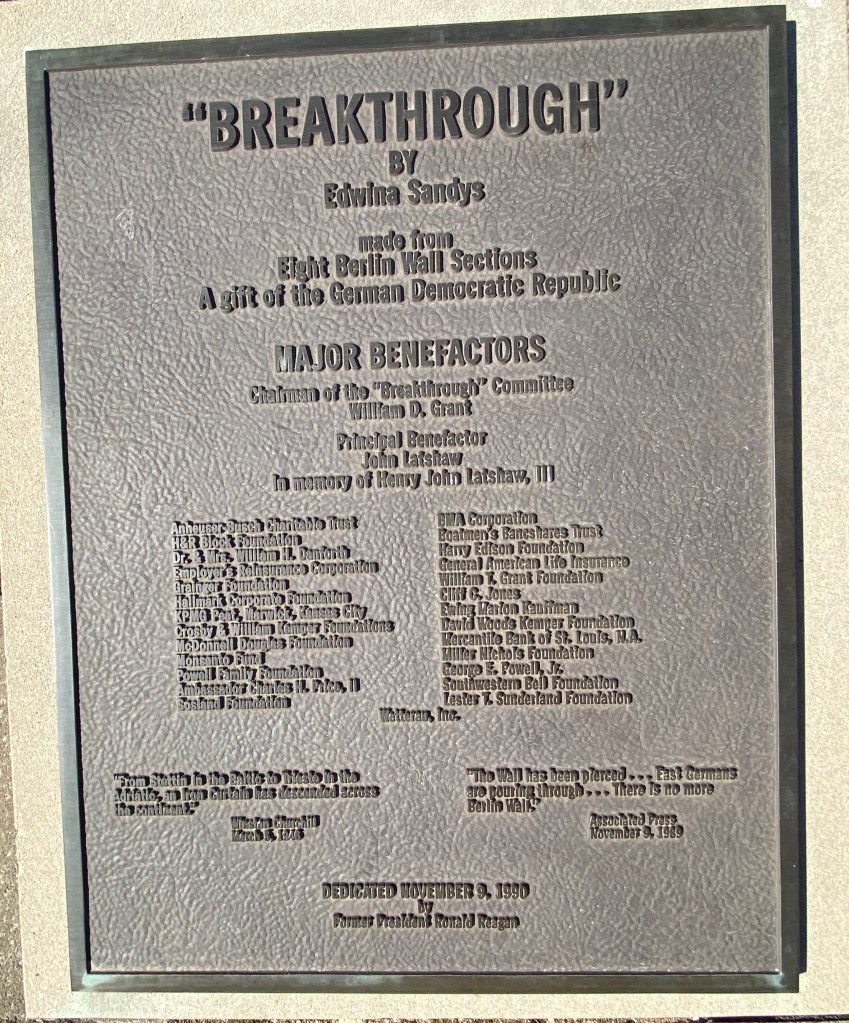 The Berlin Wall failed on November 9, 1989. In February 1990, Artist Edwina Sandys, granddaughter of Winston Churchill and her husband, Richard Kaplan, traveled to East Berlin to secure some well left. The East Berlin officials were impressed by the idea of a Berlin Wall monument being erected near the site of Churchill’s 1946 “Iron Curtain” speech, allowed Sandys to choose eight sections as a gift to the Westminster College. That was a generous donation, as 4-foot-wide sections were selling at a cost of $60,000 to $200,000 then. Edwina Sandys chose her sections from an area near the Brandenburg Gate for the dramatic color of the graffiti. Breakthrough was roughly 11 ft (3.4 m) high by 32 ft (9.8 m) ft long. Sandys cut out the outlined shapes of a man and a woman. The work was titled “Breakthough” to symbolize the breaking free of the countries and people under the control of the Soviet Union and communism. The silhouette cut-outs are part of a second sculpture entitled Breakfree, located at the Franklin D. Roosevelt Presidential Library and Museum in Hyde Park, New York.