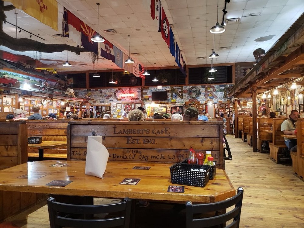 We went to Lambert’s Cafe in Ozark, Missouri, on Labor Day weekend. It was extremely crowded. We got a table after waiting in line for almost an hour. The restaurant is big, and the decor is impressive, with all kinds of interesting artifacts.