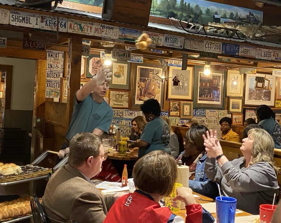 My husband caught the flying hot rolls. If a customer fails to catch one, no problem at all—the server will toss another roll. The shareable sides were very interesting because servers walked around carrying big buckets of food, asking if you wanted some, and then scooping out a big spoonful to plop on your plate. Before our meal was ready, I was almost half-full from the delicious hot rolls and fried okra. The food was great, even the iced tea I ordered was super fresh. The meal price was very reasonable.