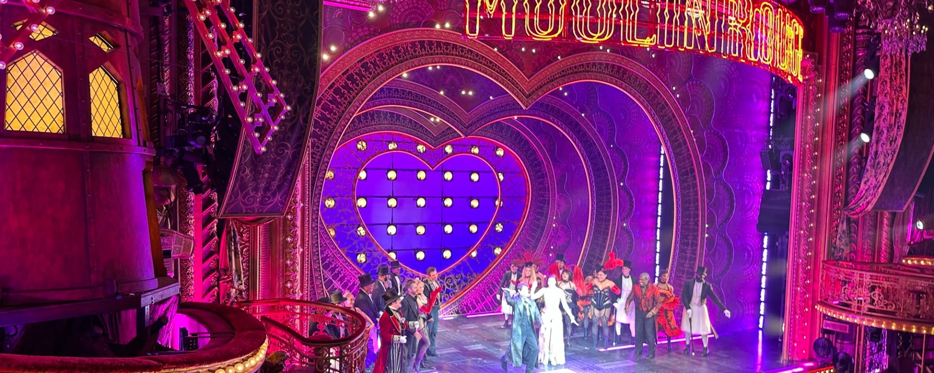 My daughter and I watched Moulin Rouge in New York City before Christmas 2024. At the Al Hirschfeld Theater, transformed into a decadent Parisian nightclub, a prominent windmill, a blue giant elephant, and the enormous neon sign light up the entire stage. Before the show started, the actors in Musical walk around the stage as part of the pre-show, allowing the audience to feel completely immersed in the world of the Moulin Rouge from the moment they enter the theatre.